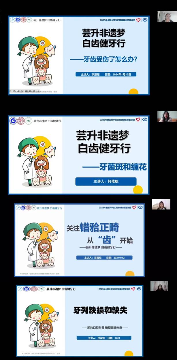 我们为同学们带来了一堂堂深入浅出的口腔健康讲座,讲述常见的口腔疾病,如龋齿、牙周病、牙齿畸形、口腔溃疡等,从预防到治疗,全方位解答了大家的疑惑。为使知识通俗易懂,让同学们更容易了解口腔知识,我们运用了大量的照片以及生动有趣的例子,讲解如何正确刷牙、发生牙外伤如何处理、蛀牙的形成、口角炎的预防等知识。强调了窝沟封闭对牙齿的保护作用,帮助在校师生掌握正确的口腔健康知识和口腔保健方法,引导大家关注口腔健康,养成良好的口腔卫生习惯。