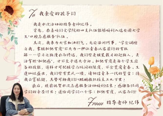 在正式开展活动前,指导教师纪伟老师为我们送上了暖心寄语,她鼓励我们在学习的道路上松弛有度,不至于迷失方向。随后团队负责人邹谨蔗对本次活动进行了介绍、规划,让此次活动更具主动性。